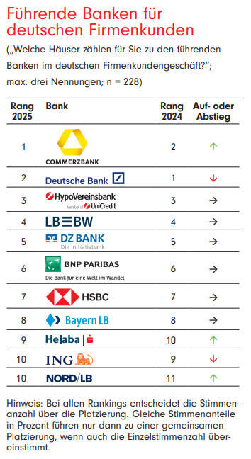 Die Commerzbank belegt den ersten Platz und überholt damit die Deutsche Bank, die im letzten Jahr die Spitzenposition innehatte. Im Cash Management, einem Schlüsselbereich für Treasurer, wird die Bank ebenfalls als führend eingestuft. Weitere Stärken der Commerzbank sind KMU, Kreditvergabe und ESG. Die Deutsche Bank liegt weiterhin an der Spitze im DCM-Geschäft, im ECM-Geschäft sowie im Bereich Handels- und Exportfinanzierung.