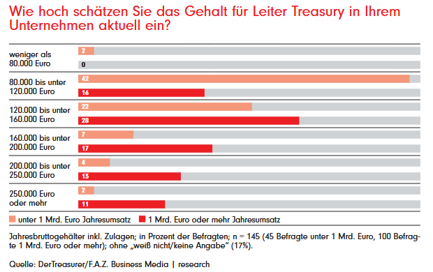 - Bei 41% der 150 Befragten mit einem Umsatz über 1 Milliarde Euro verorten sich die Treasury-Chefs in ihrem Unternehmen bei einem Verdienst in Höhe von mindestens 160.000 Euro