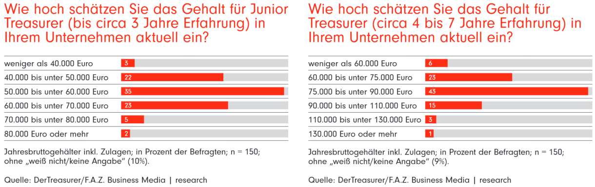 - Bei 66% der 150 Befragten erhalten Treasury-Chefs ein Jahresgehalt zwischen 80.000 und 200.000 Euro.