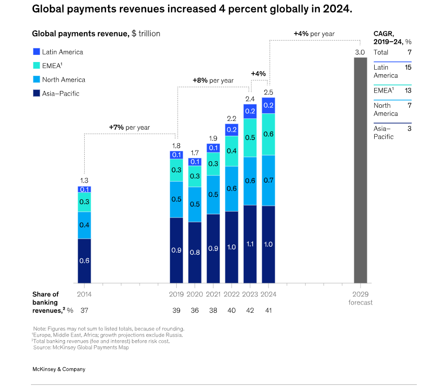 - From 2019 to 2024, global payments revenue increased on average by 7% annually.