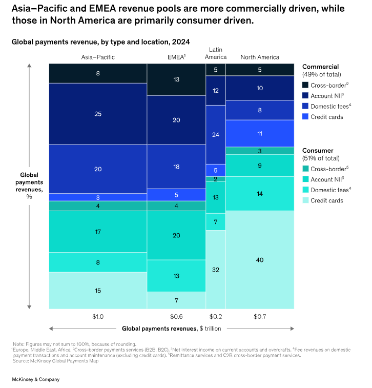 - Payment’s revenues are almost evenly split between consumer and commercial, the region composition varies