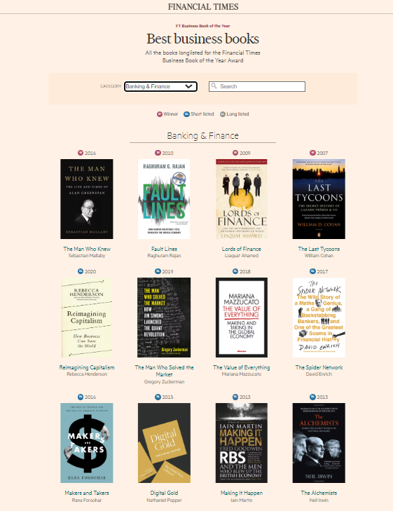 Best Business Books by Financial Times contains all the books longlisted for the Financial Times Business Book of the Year Award starting 2005. It contains 17 categories, from Banking and Finance, Economics, to Investment & Markets and more. Each book comes with a synopsis, and more details about the author.