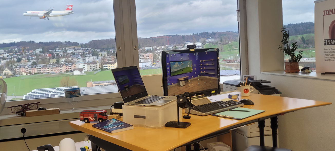 Pictured here is Tomato’s video room for Teams Meeting. For our meetings, the Tomato Team (this is Esra Kummer and me) needs a relaxed environment. Here is a typical photo when we meet on Teams. We have to admit: landing airplanes do not disturb us anymore; we’ve been in this building for over 30 years, on the 6th floor, very close to the Zurich Airport.